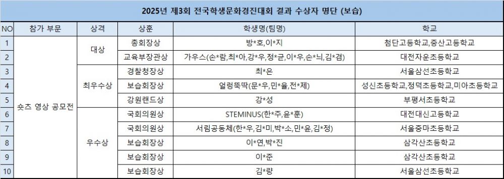 ○ 한국학원총연합회에서 「제3회 전국학생문화경진대회」 숏츠 부문 결과 발표를 아래와 같이 공지하오니 확인하여 주시기 바랍니다.