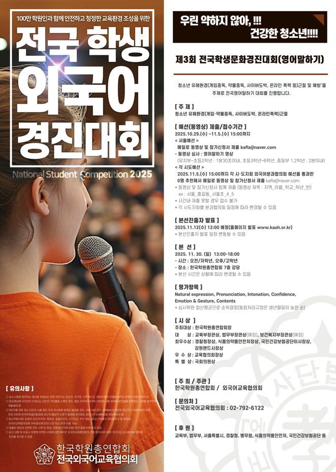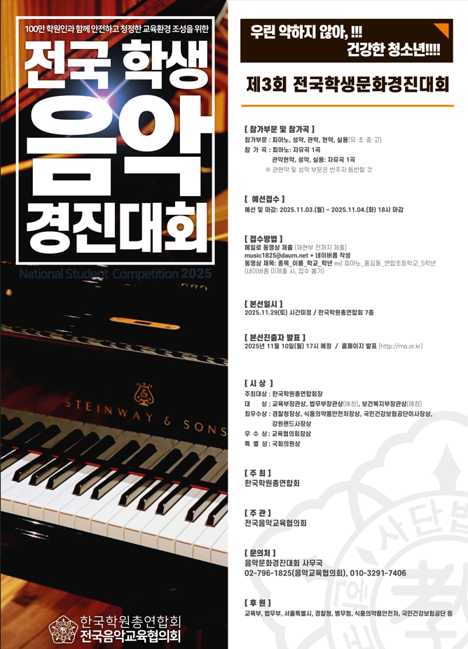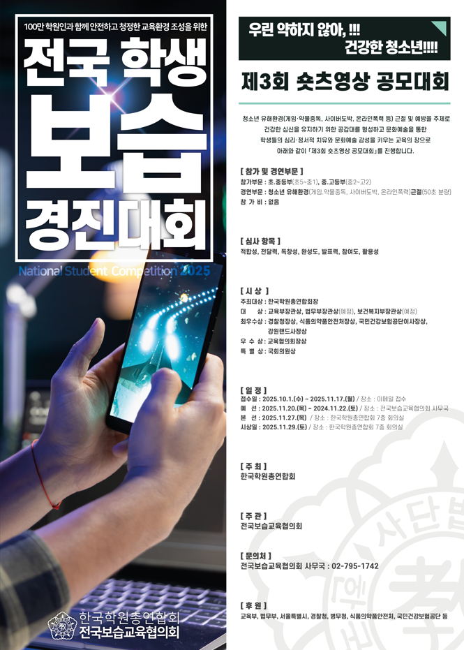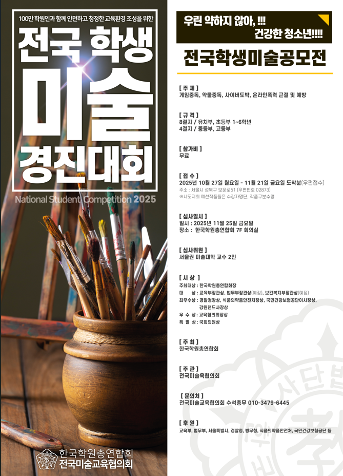 ○ 한국학원총연합회는 우리 사회에 청소년 유해환경 (게임‧약물중독, 사이버도박, 온라인폭력) 노출 위험이 증가하는 현실을 반영하여 청소년들의 심리‧정서적 치유 및 재능계발을 지원하고, 지역사회의 경각심 ‧관심 제고와 선제적 예방을 위해 「제3회 전국학생문화경진대회」 을 개최합니다.