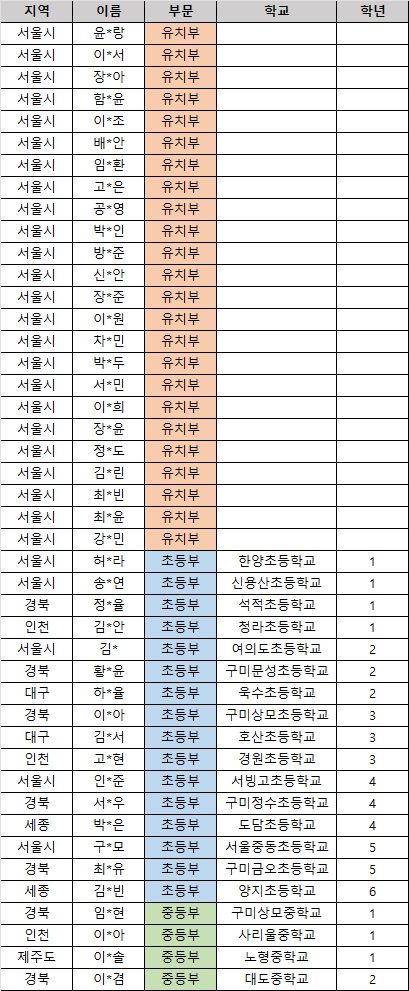 ○ 한국학원총연합회에서 개최하는 「제3회 전국학생문화경진대회」 영어말하기 부문 본선 진출자를 발표합니다. 아래 순서는 발표시간과 무관하며 발표시간은 개별 안내 드릴 예정입니다.
