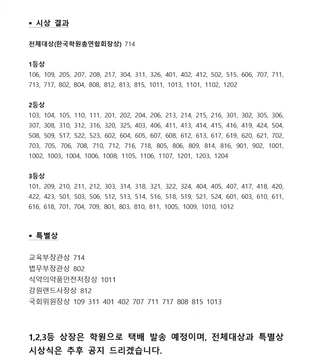 ○ 앞으로도 한국학원총연합회에서 개최하는 「제3회 전국학생문화경진대회」에 많은 관심 부탁드리며 관심을 갖고 참여해주신 전국 학생 여러분들께 감사드립니다.
