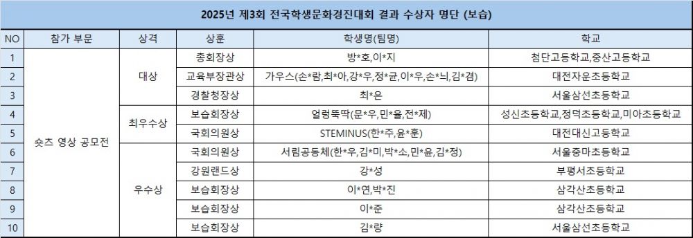 ○ 한국학원총연합회에서 「제3회 전국학생문화경진대회」 숏츠 부문 결과 발표를 아래와 같이 공지하오니 확인하여 주시기 바랍니다.