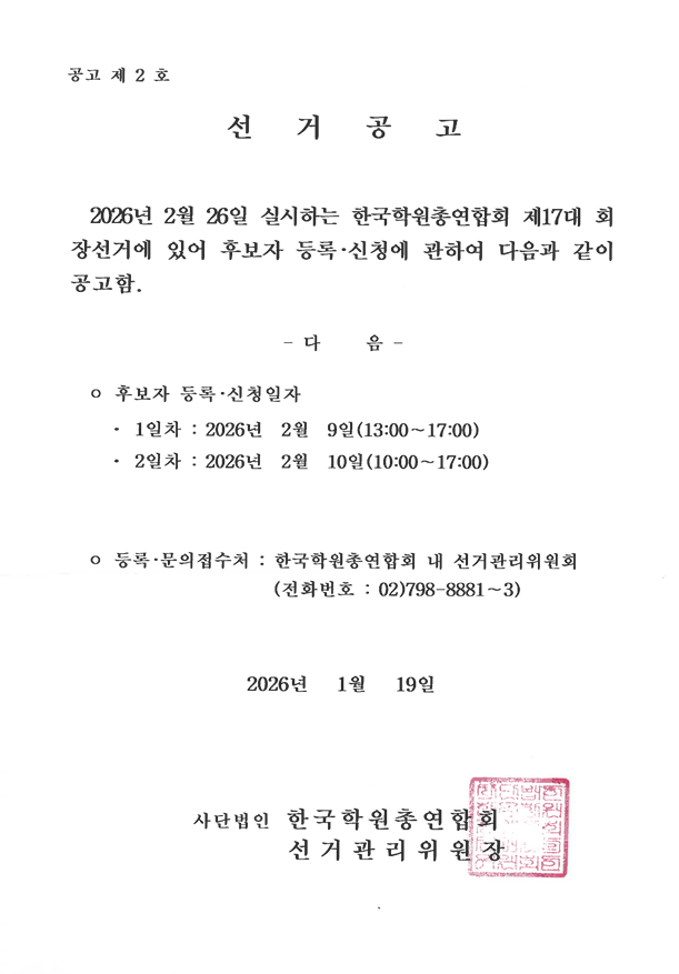 한국학원총연합회 제 17대 회장 선거 공고를 본 게시글을 통해 안내드립니다。